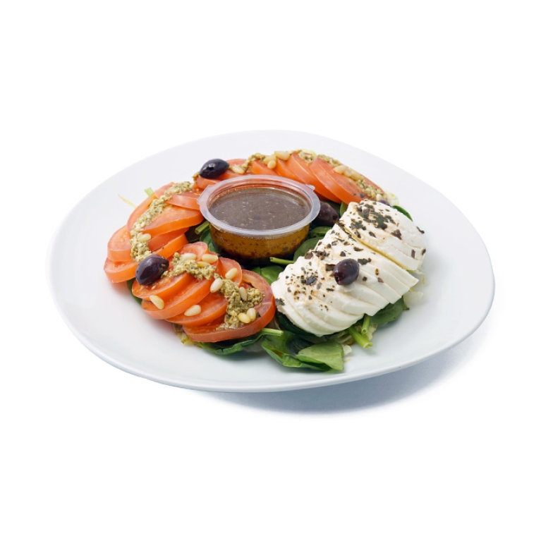 Salade, tomate, mozzarella, pesto, sauce balsamique.