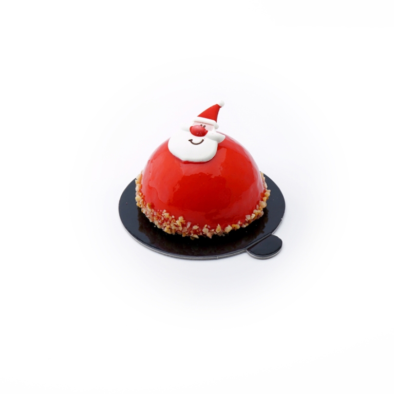 Biscuit madeleine, mousse framboise, glaçage, amandes hachées, décor chocolat.