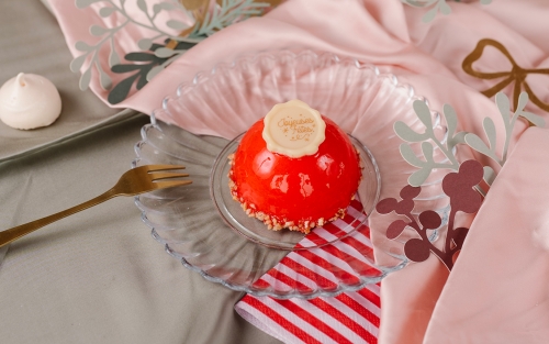 Biscuit amandes, mousse framboise, crème au cassis, confit de fruits rouges, croquant au chocolat blanc.