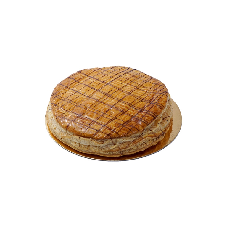 Pâte feuilletée, fourrage à base d'amandes, rhum, pépites de chocolat noir. Fève non comestible.