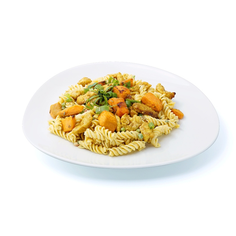 Lët'z Nuddel Fusilli, filets de poulet émincés, sauce curry & coco, patate douce, pois extra fin, poivron rouge, tomate en cubes, oignon botte.